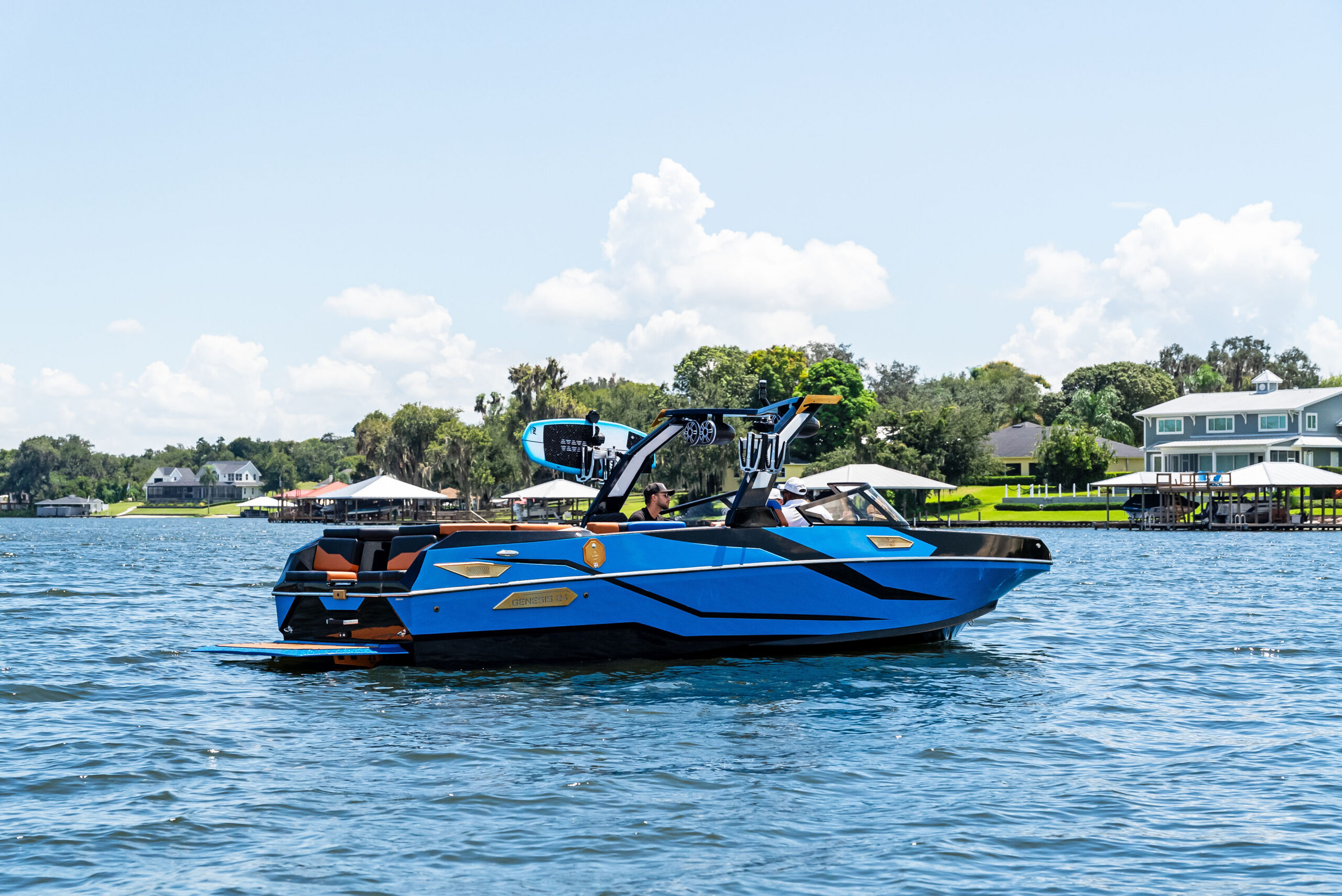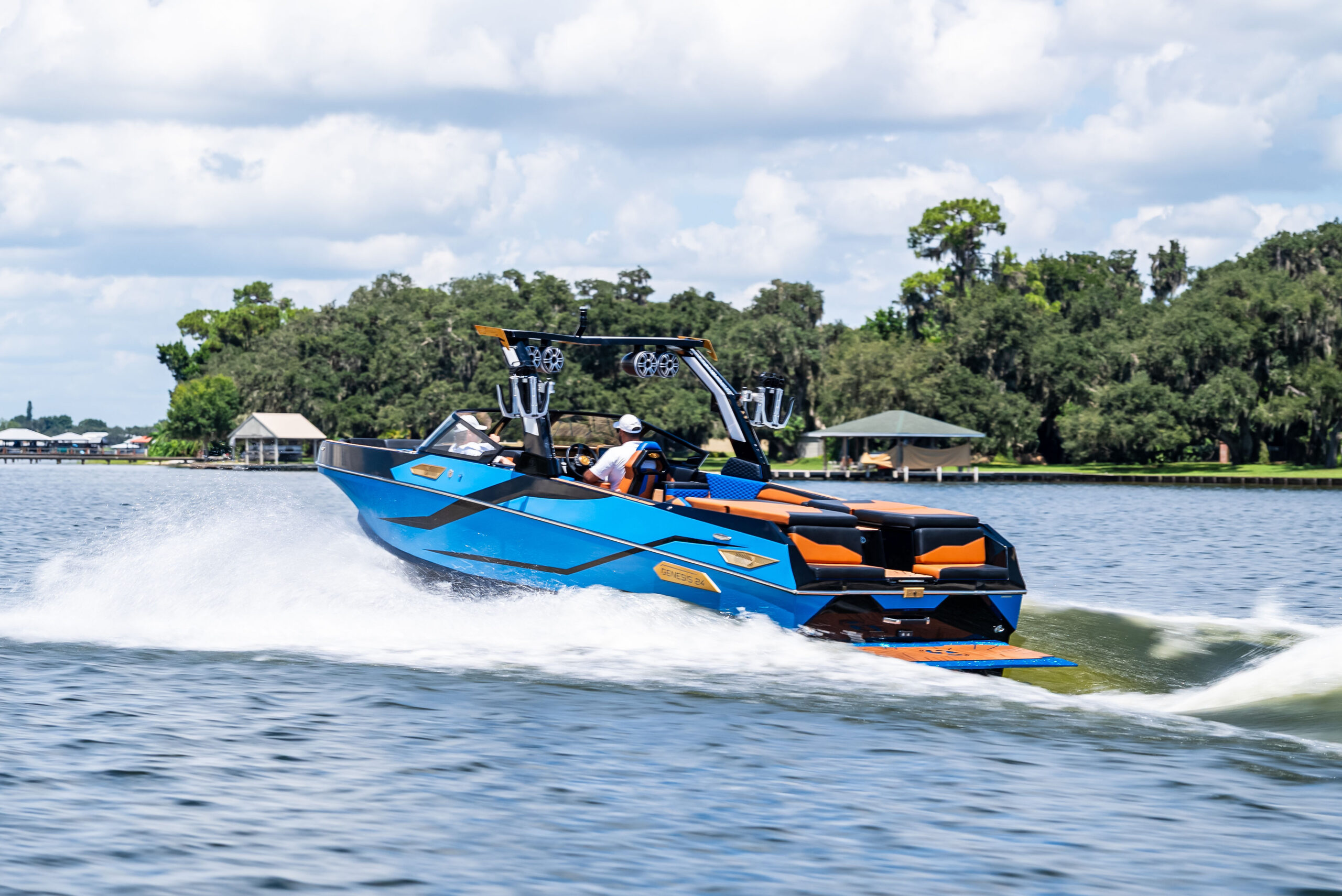 Wakesurfing demands massive displacement, which traditionally requires massive fuel consumption. The Genesis 24 addresses this through a displacement-optimized, super deep-V hull designed to create powerful waves while achieving an 80% reduction in fuel usage. This energy-efficient geometry allows for “Silent Surfing” all day long. Control is centralized through the Rear Surf Command Center, an intuitive interface that manages propulsion, ballast, and energy flow, allowing the operator to focus on the wave rather than the mechanics.