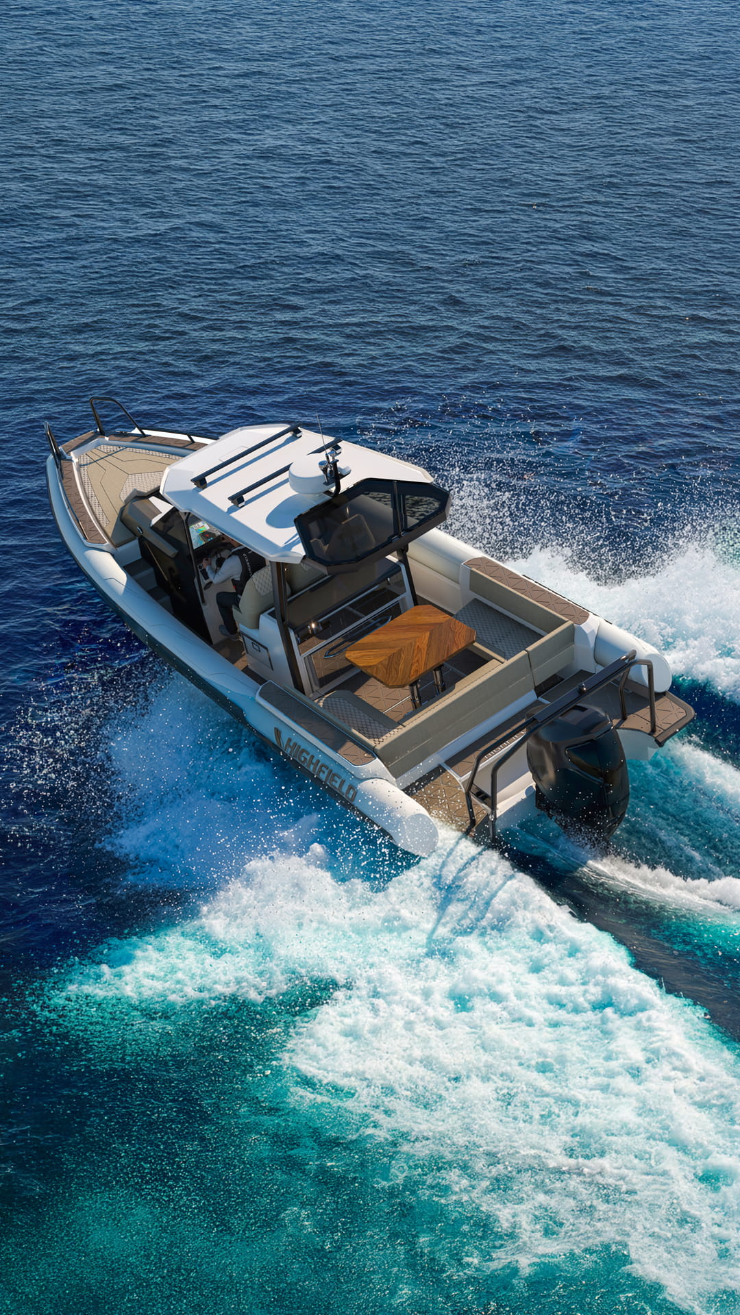 The standout feature of the ADV9 is its heated cabin, which transforms the traditional RIB experience into a genuine weekender. The interior accommodates up to four berths and includes a functional galley and head. Highfield has focused on a “flush deck” layout, ensuring that movement between the cabin and the swim platform is easy and safe for guests and crew alike. For those looking to extend their stay, an optional camper hood adds a layer of versatility rarely found in this class.