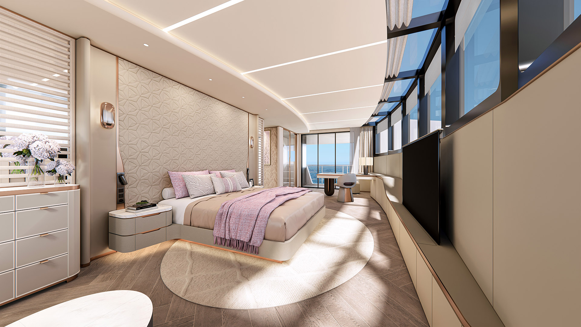 Inside, the Supertomato Studio design departs from rigid nautical norms, favoring organic shapes and a neutral palette. The open-plan layout is engineered to foster a “resort-style” atmosphere where interior and exterior living areas are fused. With a 10.5-meter beam, the volume is massive, providing panoramic ocean views at every turn. This isn’t just a boat; it’s a floating retreat designed for connection, featuring serene lounges and vibrant entertainment zones that transition effortlessly from day to night.